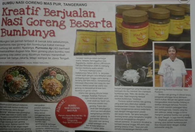 Pameran yang diadakan di kompleks kantor Kompas Gramedia di Palmerah Selatan ini sekaligus menjadi kesempatan bagi Mas Pur untuk mengembangkan usaha. Yaitu, dengan menjual bumbu nasi goreng varian Jawa yang menjadi andalannya, dalam kemasan botol.